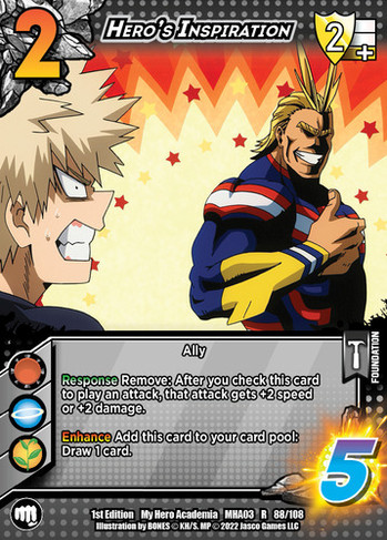 3 damage maters is not a new archetype with MHA, for example there’s both versions of Lilith from Darkstalkers. To take advantage of this we are playing a few powerful 3 damage combos. To start with we have Piercing Barrage, normally this attack has trouble pulling off it's non Combo enhance but with the help of Lilith if we have met the combo it's being sent out as a minimum as a 5 speed 8 damage attack. Swallow Your Soul is arguably Lilith's best attack, it doubles up on her damage buff and almost always nets us 2 momentum which we can use for defensive abilities on our foundations.