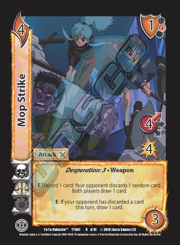 Nezu is so much fun, the ability to toolbox anything and draw when your rival draws. The big issue is finding ways to make your rival draw so you can get those sweet sweet free cards, but most of his ways in MHA Block are 1 use and that's not as fun. But we got new toys to play with(well old toys but it's like they're new!). Let me introduce you to Mop Stike, in Nezu this card is a discard 1 draw 3! With our entire attack line being 4 difficulty we can easily swap out any attack for a Mop Strike and get the card to our hand. And that's not all we also get access to Voice of Reason, which we can use every turn to discard 1 and draw 2 cards.