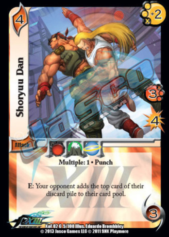 King of Fighters’ Raiden(not to be confused with Mortal Kombat’s Raiden) is an interesting take on the big dumb throws deck in that he plays little to no printed throws. Instead he can make any 4 difficulty attack into a throw for the incredibly low cost of showing a random card in his hand. To capitalize on this we are running attack like Hardened Barrage and Rapid Punches, after making them throws we can now all but guarantee those powerful responses will trigger every time.